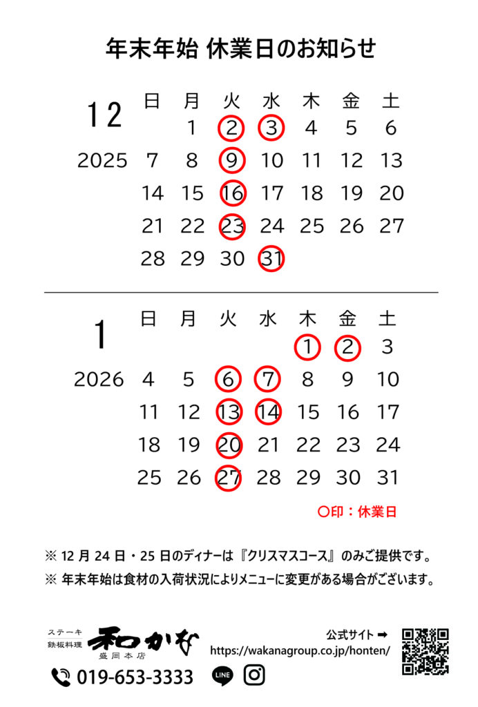年末年始休業のお知らせ